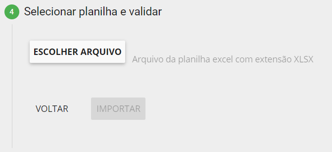 2.4 Nessa etapa você já deve estar com a sua planilha corretamente preenchida. Para importá-la, clique no botão ESCOLHER ARQUIVO, selecione sua planilha e clique em IMPORTAR. Nós iremos validar todas as informações nela contidas.