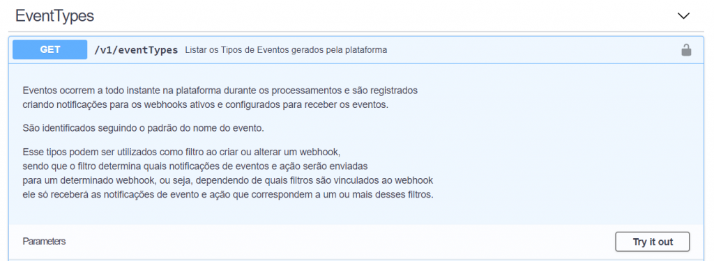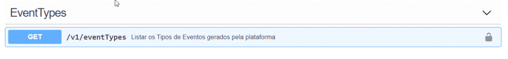 Em “Authorize” você irá inserir a sua chave de apiKey para realizar o processo de autenticação da sua conta. Em seguida, após realizar a autenticação da sua conta, desça mais um pouco a tela até localizar a URL de “EventTypes” e clique em cima do endpoint para expandi-lo.