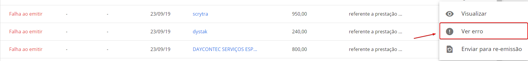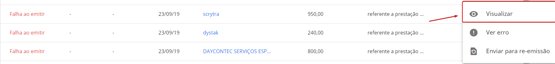 Também é possível visualizar o erro expandido as informações da NF na opção de “Visualizar”, opção disponível também dentro do menu.