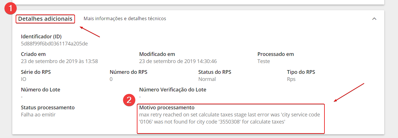 Ao final da tela com as informações da NF é possível visualizar o campo “Detalhes adicionais”, onde também será exibida a mensagem de rejeição da NF abaixo do texto “Motivo processamento”.