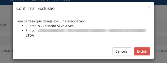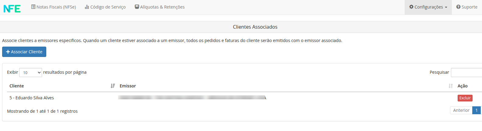Para excluir a associação de um cliente a um emissor específico, localize o cliente desejado na tabela e clique no botão Excluir. A associação será excluída e o cliente voltará a utilizar o emissor padrão definido na configuração global do módulo.