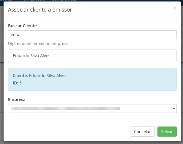 Quando múltiplos emissores estão configurados, é possível associar clientes a um emissor específico. Isso permite que um cliente utilize um emissor diferente do padrão definido na configuração global do módulo.