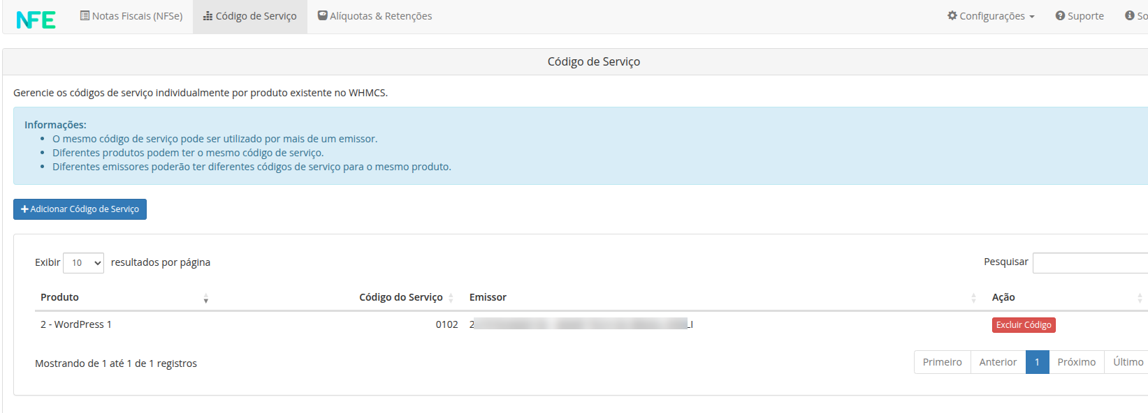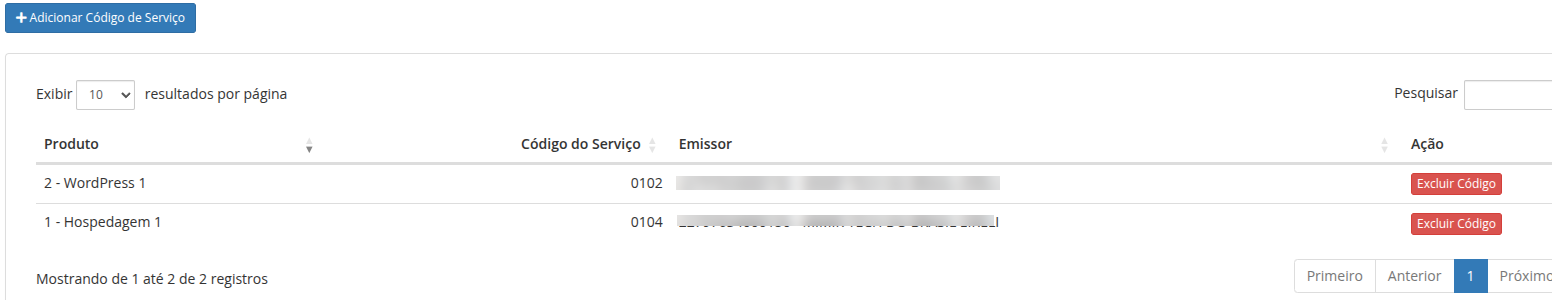 Excluir Código de Serviço