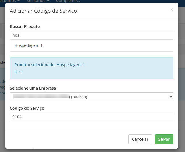 Para definir um código de serviço personalizado, clique no botão Adicionar Código de Serviço e localize o produto/serviço desejado. Selecione a empresa emissora ao qual o código estará vinculado e no campo Código do Serviço informe o código de serviço desejado, em seguida clique no botão Salvar Código.