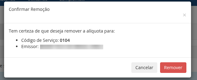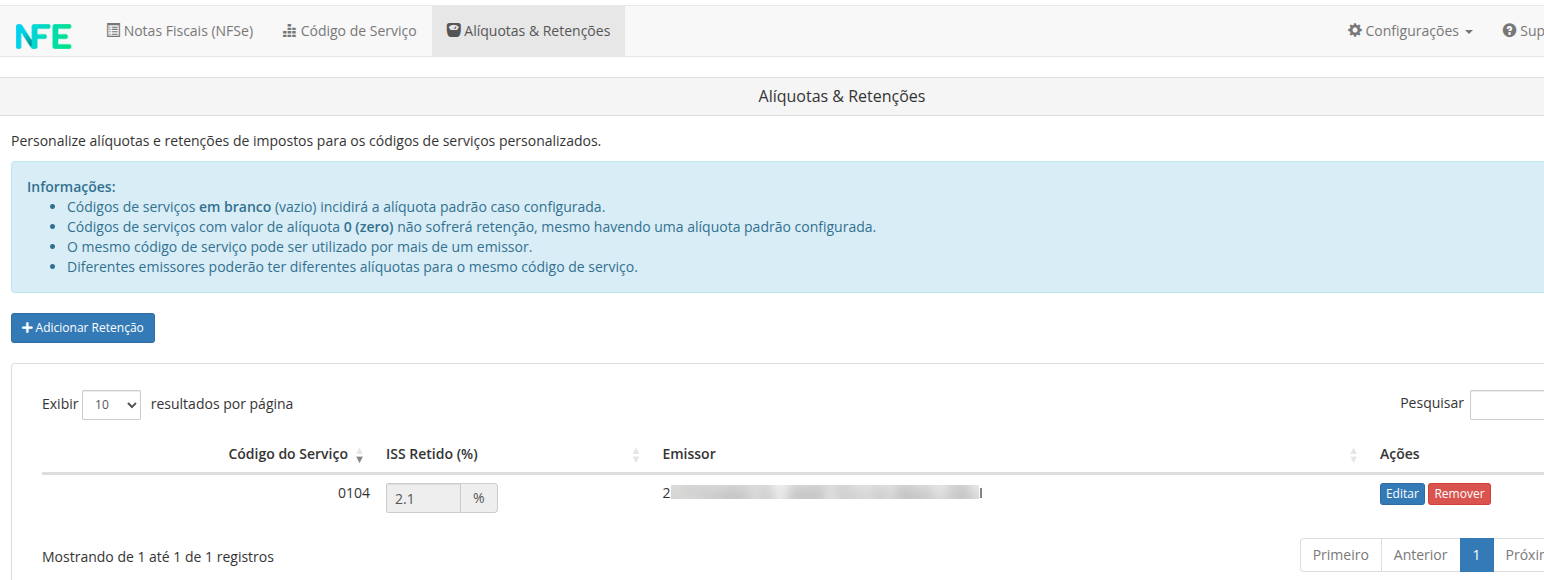Para excluir uma alíquota de retenção, localize o código de serviço desejado na tabela e clique no botão Remover.