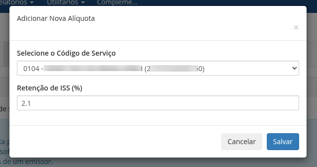 Caso existam códigos de serviços personalizados cadastrados, você poderá informar alíquotas diferentes para cada um, independente do valor definido na configuração global do módulo.