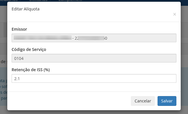 Para editar uma alíquota de retenção, localize o código de serviço desejado na tabela e clique no botão Editar. Em seguida informe a nova alíquota desejada e clique no botão Salvar.